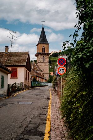 Beautiful church and traditional colorful houses in picturesque Kientzheim village, Alsace wine region, France