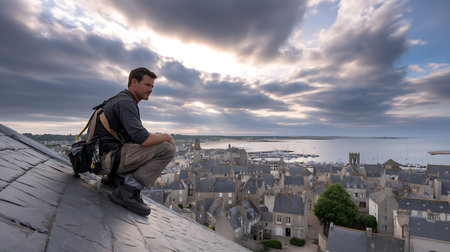 A young man with a backpack sits on the edge of a cliff overlooking the city of Dinan, Brittany, France