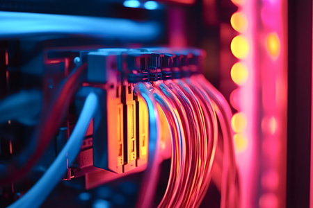 Colorful neon lights illuminating server room cables connecting to advanced hardware in a data center, creating a vibrant and futuristic atmosphere filled with energy and innovation