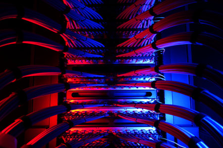 A visually striking image showcasing a network of cables lit in vibrant blue and red, highlighting the intricate technology within a data center environment.