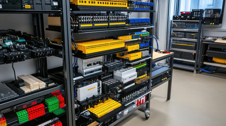This image showcases organized storage racks filled with various electronic equipment in a modern laboratory environment, emphasizing technology and efficiency.
