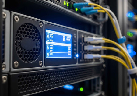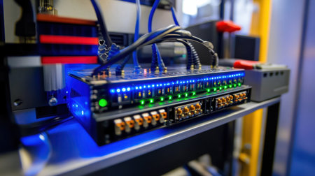 Close-up view of a data server room featuring brightly lit led panels and controls on the server racks. the vibrant blue and red lights reflect advanced networking and modern data center technology. Generative AI