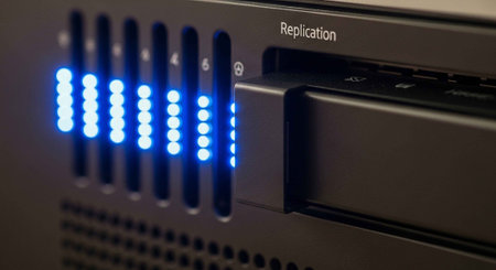 Close-up view of a computer data storage device showcasing multiple slots for hard drives, emphasizing technology in digital information management and data retrieval systems.