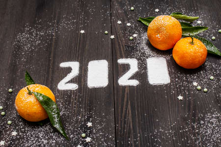 Fresh ripe tangerines with leaves, sprinkles and 2020 numbers. New Year or Christmas wooden background covered artificial snow. Festive good mood concept, copy space, close up