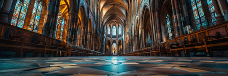 Majestic cathedral interior with high ceilings and intricately stained glass windows. Historical and religious architecture