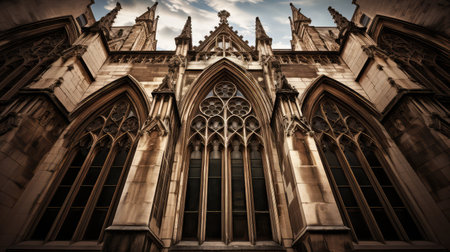 Classic Gothic architecture with pointed arches and sculpted details, blank space in background