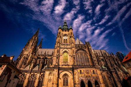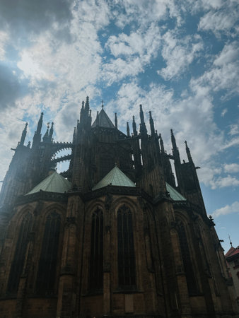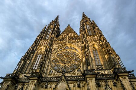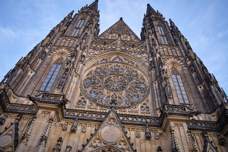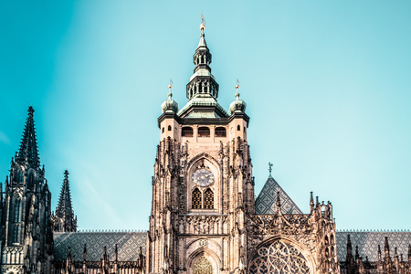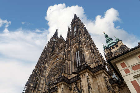 Bottom view of historical gothic St. Vitus Cathedral in old town of Prague, found in 1344, on cloudy blue sky background.