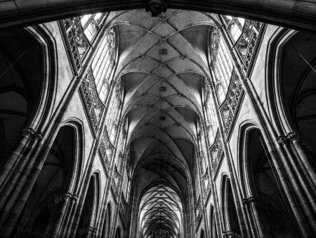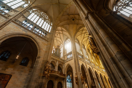 Interior of Saint Vitus Cathedral with gothic architecture.