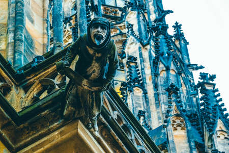 Czech architecture, scary gargoyle sculpture, gothic temple decoration. Medieval art, mystic gargoyle monster statue, St. Vitus Cathedral.