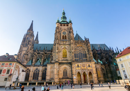 PRAGUE, CZECH REPUBLIC, 29 OCTOBER 2018: Saint Vitus Cathedral facade. Excellent example of Gothic architecture, the biggest and most important church in the country