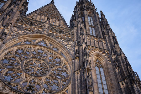 Detailed Gothic facade of St Vitus Cathedral with rose window and spires under blue sky in Prague, Czech Republic. Concept of religion, heritage and medieval architecture