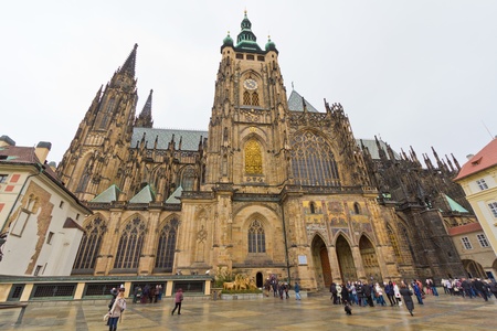 PRAGUE - MARCH 13: Tourist at Saint Vitus Cathedral on March 13, 2014 in Prague. This cathedral is an excellent example of Gothic architecture, the biggest and most important church in the country