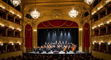 An elegant classical music concert, orchestra in full performance, audience captivated, in a grand historic theater. Resplendent.