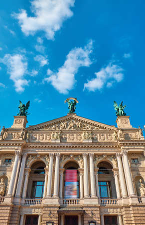 closeup facade of Lviv opera and ballet theater with different marble sculptures with detailing