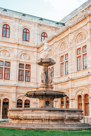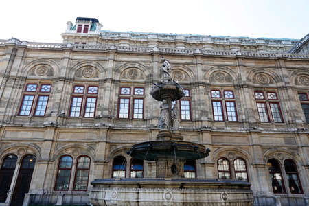 Vienna, Austria - May 8, 2018: A fountain outside of the State Opera House building in Vienna, Austria. City sightseeing.