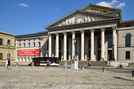 Munich, Germany - July 6, 2022: In the morning at the National Theater (Nationaltheater) on the Max Joseph square. Historic opera house, home of the Bavarian State Opera. Beside the Munich Residence