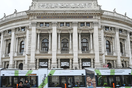 Vienna, Austria - Feb 7, 2020:Facade empty view of baroque style Burgtheater in front of city hall in winter morning