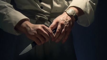 left hand holding a knife against a white wall background. crime illustration