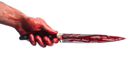 A dark-skinned hand, covered in blood, tightly grips a knife with a crimson-stained blade. The stark white background emphasizes the raw power of the image.