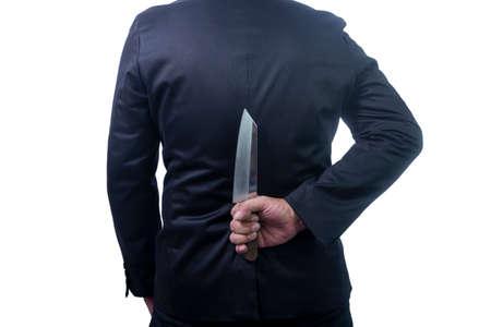 An evil man holds a knife behind his back, waiting for the victim. A maniac and a rapist with a gun.
