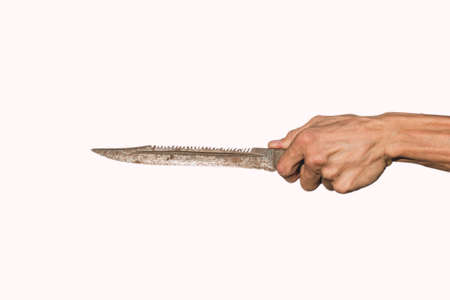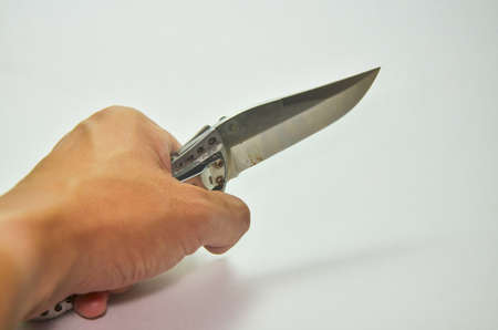 A sharp knife in the man's hand. The use of cold weapons. Knife attack . Armed raid..