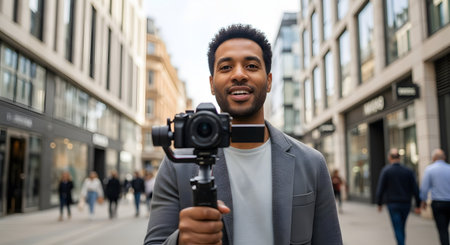 A happy Black man smiles as he holds a camera on a gimbal, vlogging or filming himself on a busy city street. He is the central focus, with blurred buildings and pedestrians in the background.