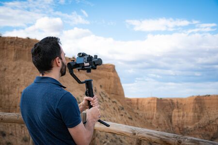 Young man filming with camera and gimbal. Portrait of videographer at beautiful sunrise.