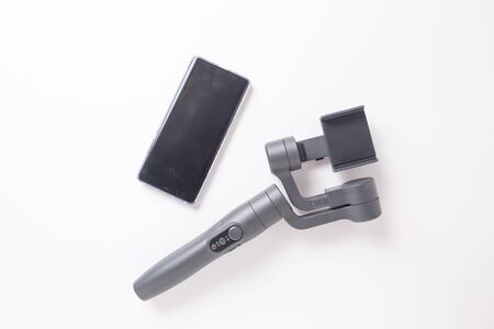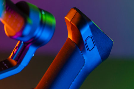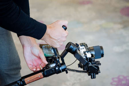 Accessories for video and photo shooting, extreme close up details. Action. Professional new modern electronic stabilizer details.