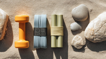 Fitness tools are arranged on sand with blank space in the center, showing resistance bands and a dumbbell used for outdoor workouts by the sea.