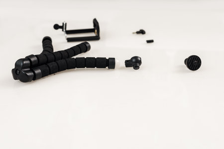 Tripod for the camera close-up. The black folded tripod lies. Dirty metal legs with black plastic snaps. Photographic equipment. Side view. Selective focus.