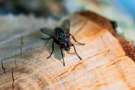 A black fly sits on a wooden table. Macro photo. Insect fly. Insect paws. Background image. Place for text. Shadow.