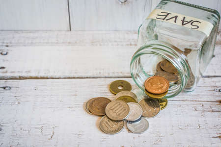 A hand is shown placing a coin into a clear glass jar labeled 'SAVE'. The jar is filled with various coins, and additional coins are stacked in front of it.