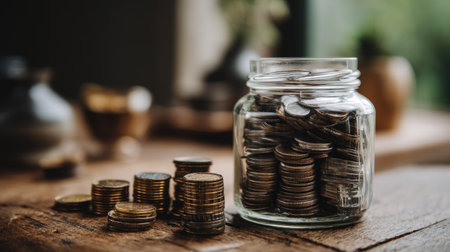 A captivating scene featuring a clear glass jar filled with coins, surrounded by neatly stacked currency on a rustic wooden table, depicting themes of savings and financial growth.