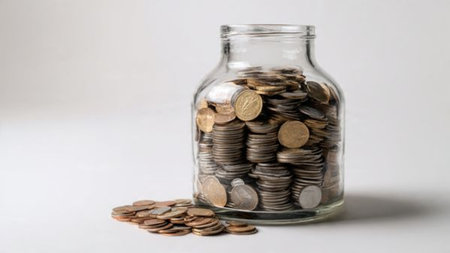 Minimal financial planning visual showing a jar filled with coins under diffused lighting.