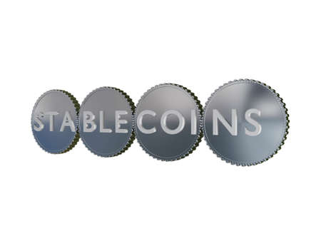 3D illustration of letters on four coins composing the word Stablecoins, isolated on white.