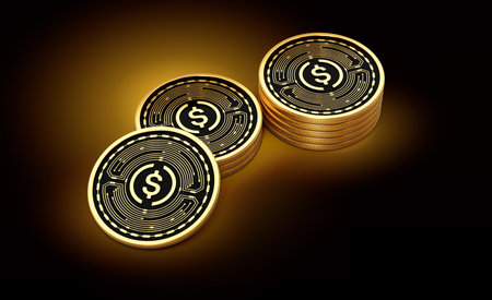 Stack Of Golden Cryptocurrency USD Coin USDC Coins On Shiny Golden Glow Background 3d Illustration