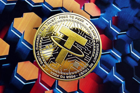 Concept of Tether coin against golden bitcoin coins and a single US dollar coin. Tether is backed by US dollar and used for trading in alt coins