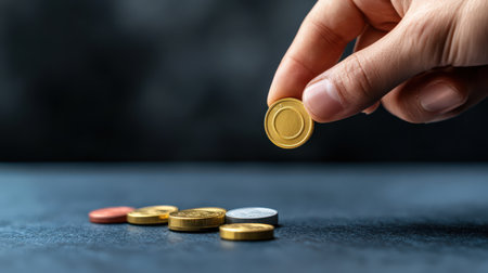 Hand placing a gold coin on a growing stack of money, symbolizing financial planning, increasing wealth, saving for the future, and making smart investments in personal finance