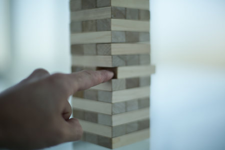 Hand of pulling wooden block before fail on building tower at home and drape change, choice business risking dangerous project plan failure construction