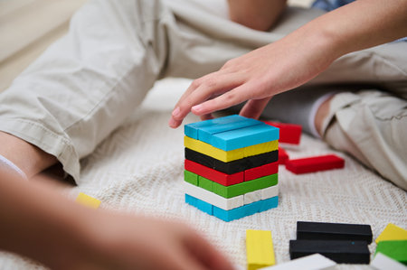 Two young people enjoy a fun and engaging stacking game on a cozy rug. The colorful blocks add vibrancy to the scene, emphasizing concentration, teamwork, and leisure. Ideal for depicting friendship, casual indoor activities, and playfulness.