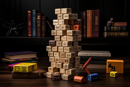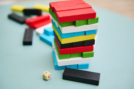 A colorful stack of wooden blocks forms a tower, with a black block and dice beside it. The game symbolizes balance, strategy, and fun, making it perfect for family time or parties.