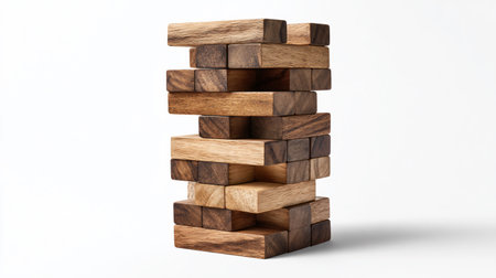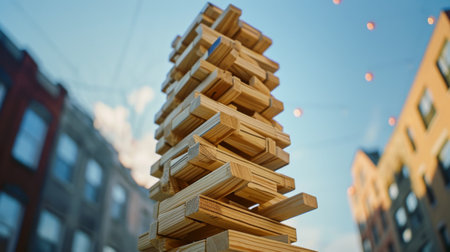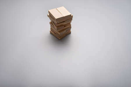 This image showcases a stack of wooden blocks leaning at a slight angle against a soft white background, ideal for creative and educational themes.