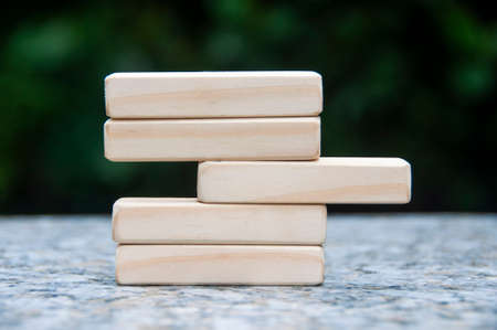 Blank wooden block leaning on a structure made of many other blocks with several of them still lying scattered on a textured rustic wooden desk. Conceptual of leisure game or start up business