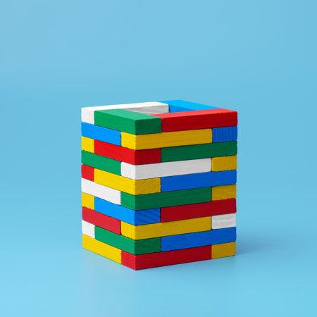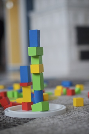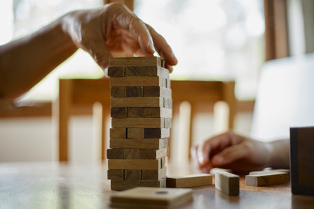 Close-up of hands carefully stacking colorful wooden blocks on a table. The image captures the precision and focus required in balancing the blocks, conveying themes of concentration and strategy.