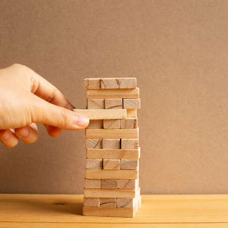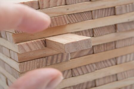 Woman hand slowly pulling wooden block from unstable blocks stacking.