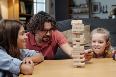 Family enjoying game of Jenga, with father engaging with daughters around table at home. Living room setting with cozy ambiance enhancing family bonding and fun
