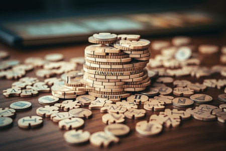 A photorealistic, highly detailed image of a vertical, geometric stack of wooden letter blocks. The