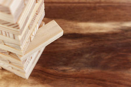 Wood block tower with brown background. Block stack game. Business risk, development, growth, strategy concept. with copy space