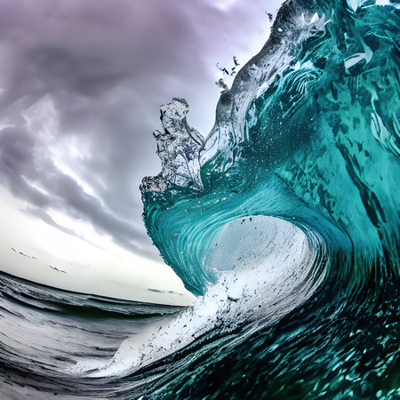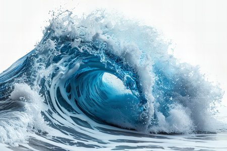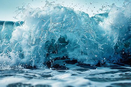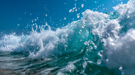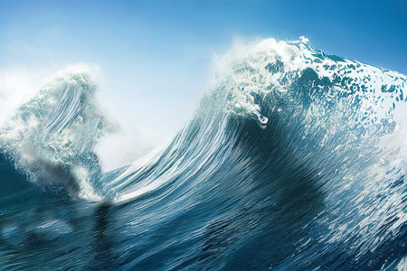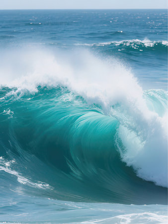 A vibrant, rolling sea crest erupts with force, its deep blue hues contrasted by a luminous sky, embodying the raw energy and mesmerizing allure of the ocean.
