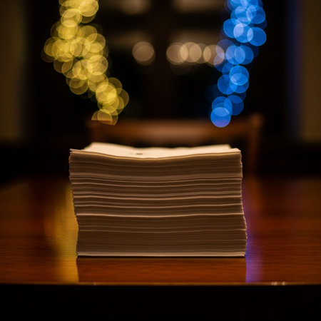 As the day ends, the setting sun casts a warm, golden glow across a meticulously organized stack of documents.